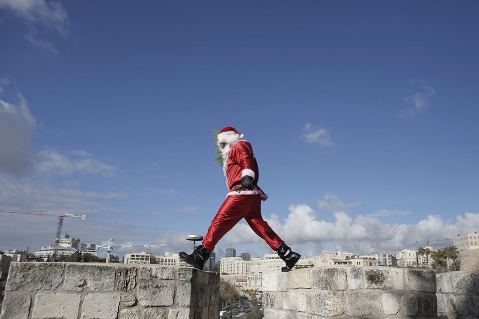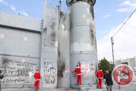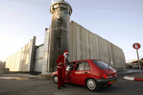 Ativistas palestinos vestidos em trajes do Papai Noel fizeram pixações no Muro da Vergonha, que separa as cidades de Jerusalém e Belém, na Cisjordânia, quinta-feira passada. Eles escreveram slogans a oito metros de altura, exigindo o fim da ocupação israelense e liberdade para os palestinos.